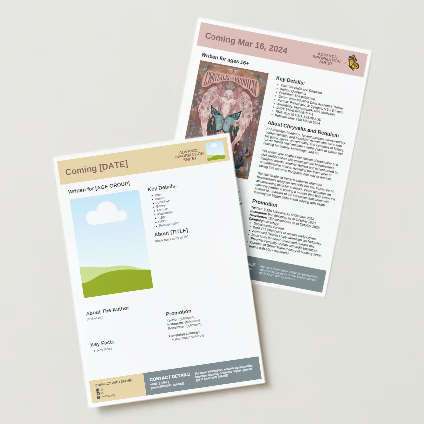 According to Writers & Artists UK, an advance information sheet is a sales and marketing document which contains information about the content and format of the book, as well as key selling points, intended audience, promotions and reviews that is circulated to booksellers, potential retailers, reviewers and customers.